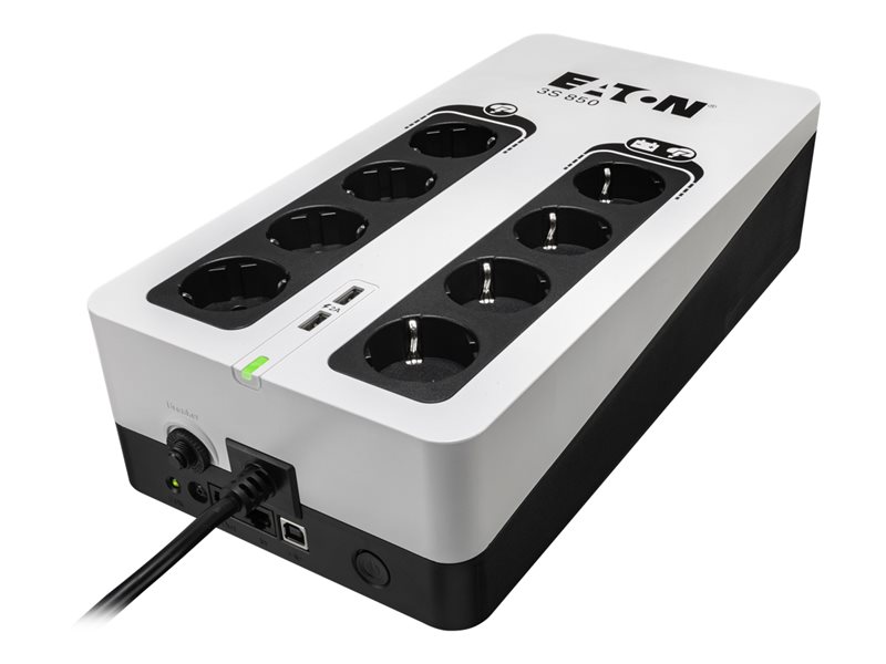 Eaton 3S850D. Topologie UPS: Veille, capacité de la puissance de sortie: 0,85 kVA, Puissance de sortie: 510 W. Nombre de prises en sortie: 8 sortie(s) CA. Technologie batterie: Sealed Lead Acid (VRLA). Couleur du produit: Noir, Blanc, Longueur de câble: 1,5 m, Sécurité: IEC 62040-1; IEC 62040-2 C2; IEC 62040-3; IEC 62040-4; IEC 61643-11. Largeur: 335 mm, Profondeur: 170 mm, Hauteur: 86 mm